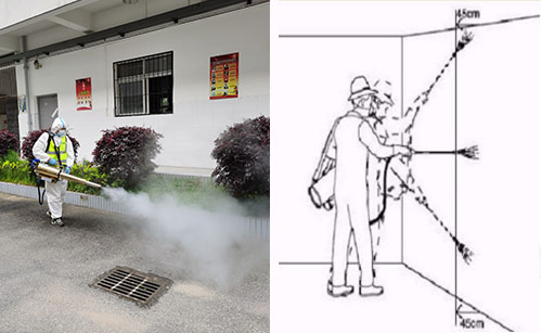 噴霧技術(shù):掛流狀態(tài); 1、橫向噴灑幅度為75 cm; 2、左右幅度間應(yīng)有5 cm的重疊; 3、自上向下噴灑; 4、首先自上向下噴灑,結(jié)束一個(gè)噴灌噴 灑幅度 后,順時(shí)針橫移,開始下一個(gè)幅度噴灑; 5、保持噴嘴距離墻面45 cm; 6、開始噴灑時(shí)首先向前傾斜,當(dāng)噴嘴向下噴灑時(shí),身體向后傾斜; 7、自時(shí)口順時(shí)針操作,直至房間處理完畢; 8、對人體接觸較多的柜臺、桌椅、門把手、水龍頭等可用0.2%-0.5%過氧乙酸溶液或有效氯為500mg/L-1000mg/L的二氧化氯消毒劑進(jìn)行噴灑或擦拭消毒,作用時(shí)間15-30分鐘。